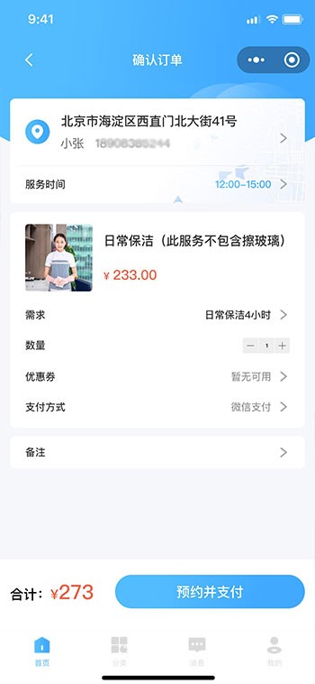 1、用户微信下单:在线选取服务需求,并填写姓名、电话、地址等预约信息,付款下单预约。